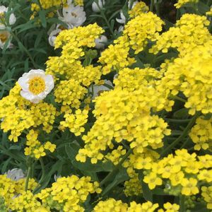 黄花アリッサム 鮮やかな黄色🌼少し甘い香り 草丈も高くなりすぎなりし、夏冬は余裕で耐えちゃうし、葉色は少しシルバー🌱 こぼれ種で増えちゃうけど、扱いやすくてお気に入りの子😊 黄モッコウの垂れ下がる中に花壇から存在感MAXで咲いてくれてます。