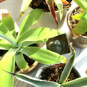 「ミズラ君アガベ林で寛ぐ」 急に夏のような陽射しの中 アガベたちの木洩れ日で 寛ぐミズラです。 どこにいるかわかりますかな〜