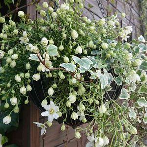 クレマチス カートマニージョー❤️ 宮崎園芸さんで飾られていた大株ハンギングの可愛さに魅了されて、 蕾が鈴生りの一鉢を買って帰り、ハンギングにして1週間🍀 だいぶ白いお花が咲いてきました❗🌸 たまらなく可愛い😆💕