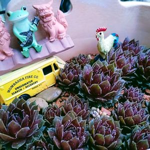 こんばんは🙋 今日はシーサーの日~🐱✨🐱 10数年前に沖縄でお迎えしたシーサーと共に✨ さきゅまるさんの箱庭セットが届いたので早速寄せ植えしました😁✨ 2作目は湖です🐚 一緒に来た透明のくろすけは第一弾の箱庭に仲間入り🎵 1作目も生き生きと育ってます😆✨