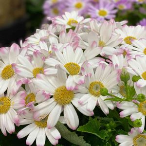 ✨サイネリア(シネラリア)✨ 店先の鉢植え‼️ 薄ピンクの角度によっては白に見えますね❣️ 真ん中の紫が効いてます(o^^o)