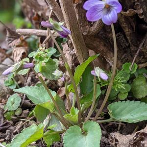 コスミレだと思います♪ 葉の形で! 山道、民家近くにて。 寒くてもスミレは咲いていますね〜