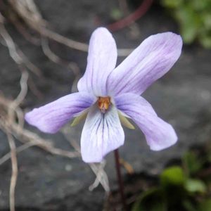 前のスミレよりやや標高が低いところで撮影しました。 柱頭はカマキリ型で、側弁には、僅かに毛が生えています。距は短い。 地上茎は、ないようです。 スミレサイシンまたはナガバノスミレサイシンではないかと思っています☹️ その後、はなさんの指摘もなり、現時点では、名前を特定できませんが、スミレサイシン類よりミヤマスミレ類のようです。 chibiさんに、コスミレと教えて頂きました🙇