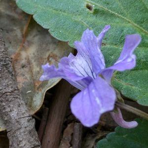 コスミレ(小菫) 北海道、本州〜九州までの人里離れた山野に生える 草丈 5〜10cmの多年草 花期 3〜4月 葉は数多く束生し、花期のものは長三角形で粉白い 葉の裏は薄紫色を帯びる 西日本のものは側弁の基部に毛が生えたものが多いが、東日本のものは毛が生えないのが普通 鋸は長め タチツボスミレに似ていますが、ここでは色も濃く、葉の形や質感が違うので、この花であると判断 いつもは行かない、人里近いお山の方で見つけました スミレは種類が多く葉の形や質感で判断できることもあるので、葉の写真を撮るのも大事かな?