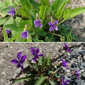 公園の敷石の隙間から出ていた小さなスミレです。✨ ↑は、1cm位 ↓は、7~8㎜位です、↑は、花弁な紫の条があったのでコスミレ。↓は葉の裏は、紫ががっているのでヒメスミレとしました😃 1日考えて頭が痛くなりそうです😰お助けを…🙏🙇😁