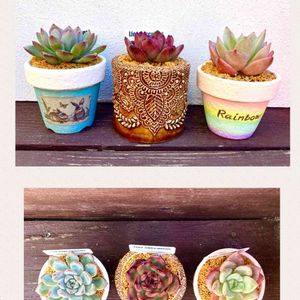 連投失礼します。前の投稿の続きです。 リエール苗を植えました。 どれも2号鉢サイズです。 真ん中の『チェム』の鉢は、値段を見ないで買ったら4000円もしてびっくりの、作家さんの鉢です。 『NOBU鉢』というそうです。 ちまちま屋のお客様に見せて元を取りたいです🤣 チェムの深いレッドが大人可愛いです〜 右は、私がこの『セラザード』のために作ったレインボー鉢に植えました。 淡い緑とピンクのグラデーションがとてもキレイな苗なので、グラデーションが似合うだろうと頑張って作りました💦 でも、苦労しただけあって、なかなかマッチしてて嬉しいです! 左はこれも今回作ったリメ鉢に植えた、『ブレイブ』です。 こちらもレインボー鉢に植えようかと思いましたが、どうも合わないので、苗のカラーに合わせてまた昨日作りました。 ブルー系統の苗なので、ブルー系統の鉢が似合うようです。前に作ったものとデザインは同じで、大きさ違いのものを作りました。 ファッションでもそうですが、似合う色ってありますね〜。 淡い色の苗には淡いカラーの鉢が合うし、濃い色には濃い色の鉢が合いますね。 私はリメ鉢作りがあまり好きなわけではないのですが(いいのが売っていたら買います😅)今回は合うものが作れて満足です😊