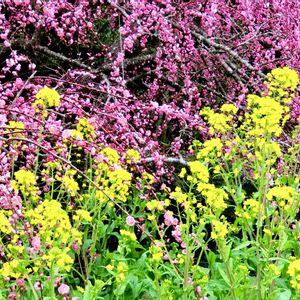 "春色のコラボ" 五岳の里公園、濃淡2種の紅梅と菜の花が春色の素敵な共演を見せてくれました。 撮影日 2022.3.2