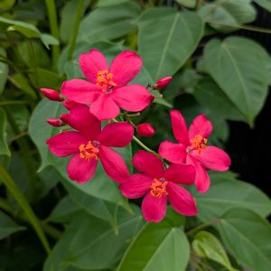 テンキンザクラ(提琴桜)です。 鮮やかな赤い花です。 南洋桜、提琴桜、南洋アブラキリ ヤトロファィンテゲリマ色々な呼び名があります。 寒さに弱いので温室で育てられてます。 服部緑地都市緑化植物園カメリアルームにて