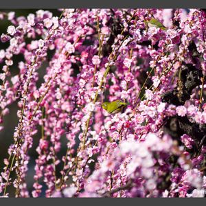 津市結城神社のしだれ梅。綺麗にピンクの花枝がしなります。丁度メジロが密を吸いに飛来しました。