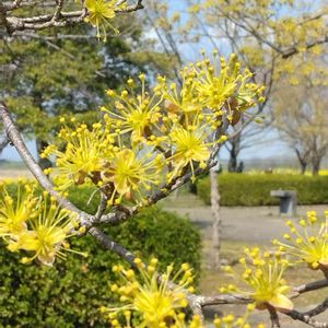 🌲山茱萸🌲 ソメイヨシノに負けず劣らずな大木に出会いました サンシュユ…とは 山にある茱萸(グミ)の事だそう そのグミが頻尿、滋養強壮に効くんだとか 日本に渡ってきた時に、薬効に注目されてそのままサンシュユと呼ばれたらしい でも、 牧野富太郎先生は、その花の美しさから 春黄金花(はるこがねばな)と呼んでいたとか 朝ドラ、らんまんはお花ファンにはたまらないですね〜ʚïɞ.•*¨*•.¸¸♬ 🌪️今日は、強風です!! 関東にも黄砂がやって来るらしい!! ヤバいっす!!!