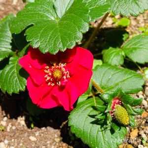ローズベリーレッド🍓 赤いお花が咲く🍓ちゃん 一つ首をニョーんと伸ばして咲きました💕 お花も可愛いし、いづれ食べれると思うと 愛おしい( ^q^ )🍓