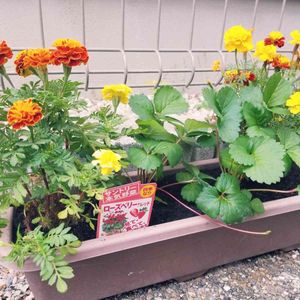 サントリー本気野菜( *´艸`) ローズベリー・レッド いちご 初めての家庭菜園です! 子供たちに自分で育てて収穫して欲しいと思い始めましたが、上手く実がなると良いなとコンパニオンプランツとして、マリーゴールドも一緒に植えました。 水やりは子供たちにお願いしてます。