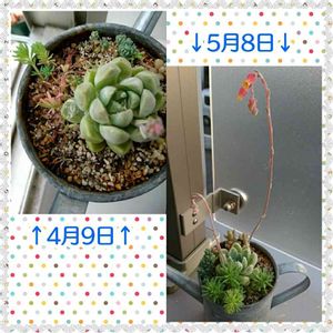 おはようございます。 子株がにょきにょき伸びてきているゲッセルリンゲアーナ。 この子は紅葉しないのかな?緑のまま。この子も以前100均で仕入れました。