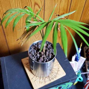 テーブルヤシ 百均の複数株植えから株分して単幹植えにした物です。 屋外の軒下で管理しています。