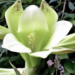 パイナップルリリー🍍 もう1株、白花ありますが そちらは全く咲く気配なし… 何年も植えっぱなし。 可愛いなぁって愛でるのに、肥料もなし… さすがに手入れしてあげないといけないかも。