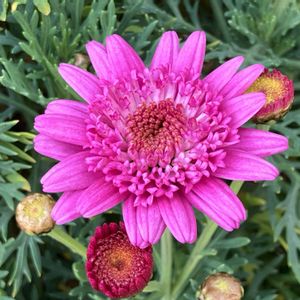 冬越し成功の PWマーガレットスウィートピンク💓 アンバサダー苗でなく、昨年園芸店でお迎えしました〜☻︎ PWのマーガレットは、連続開花性があるようで長く咲き続けてくれるのと花色の変化も楽しめるのが嬉しいです⸜( ´ ꒳ ` )⸝💞 ボネット(帽子)咲きが可愛らしいです〜( ^ิー^ิ)ニヒッ