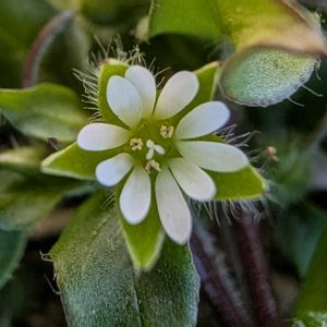 今日のお花 ハコベ🤍✨ 今朝見た時は凍みて(方言?)ました🥶 さっき撮りたてのハコベです。かわいいお花🤍ですね! 春の七草の一つ。 寒い中でも元気なので普段から食べると元気になる気がします💪摘んで食べようかな?💖🤍💚