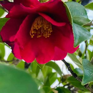 外国椿のファイアーダンス🔴🌿が開花してます。大きな花です。 服部緑地都市緑化植物園内カメリアルーム