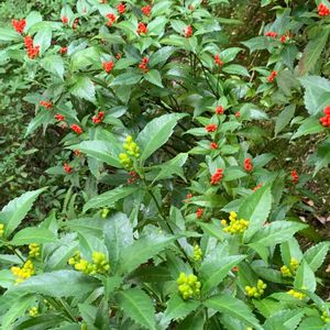 ヤブコウジ センリョウに続いてジュウリョウです。 赤くなりかけの微妙な色あい🚼 サクラソウ科ヤブコウジ属