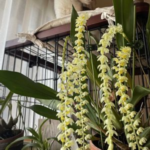デンドロキラム コビアナム ラン科 原産地 フィリピン 長い穂が下がってユラユラ揺れる姿が美しい… 昨年株分けしたので花数は今ひとつですね。💦 来年は下がる花穂は見応えがあると思います。🤷♀️