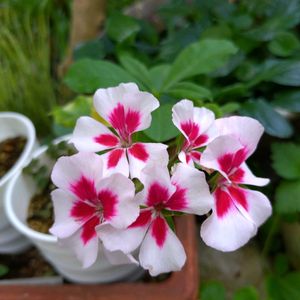 🍀ゼラニウム🍀 ①スーパーゼラニウム・チャンピオンロージー 去年花友Yさんから挿し芽でもらった子。全く大きくならないよ〜😅💦💦💦💦💦 どの子も棒だけの茎に 枯れ枯れの葉っぱ🍂 もうだめかと思っていたゼラニウムたち。 少し暑さが落ち着いたら お花を咲かせてくれました。