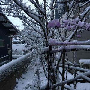 昨日は今年初めての積雪です☃️❄️ 木の枝に積もった雪がハウスのLEDに照らされてピンクの花が🌸咲いてるように見えるのは…私だけかなぁ💕 此処の夏場は、ヤマボウシの葉で直射日光を遮ってくれる蘭達の憩いの場所になります😆😆😆 🌱🌱🌸🌼