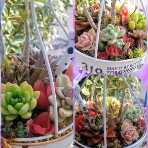 出来上がったリメ缶に寄せ植えしてみました♡アレもコレもと詰め込んだら大変な事に💦 (思いのほか入りました🌱) ぶら下げる場所があまり無いから考えないとなぁ~😅
