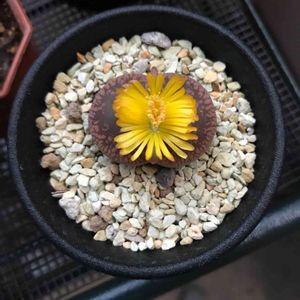 リトープスのお花が咲きました!! 夕方に咲いたのでちょっと暗いですが…。 可愛い黄色のお花です🌼 普段仕事から帰宅する時間より少し早いタイミングで閉じてしまったので、もしかしたら数日前から咲いていたのかも? 今日は早く帰れたので見れて良かったです!