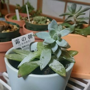 で、いろいろ購入 本来はメセンを探す目的だったけども、ああいったたくさん並んでる場所はダメだね、すぐ目移りしてたくさん買っちゃう まずは念願のリトープスを確保 たくさんのエケベリアが並んでいて血が騒ぎ、脇芽の出たメキシコミニマを、ふわっとした輪郭線に惹かれてプラティフィラを一緒に購入 ついでにサボテンのキーホルダーも購入 いい買い物したわ "リトープスを買ったら、スペース的な都合と冬を迎える都合、一旦新規購入は控えよう"って決めてたんで、しばらくは新規購入は落ち着くかなって そしていつもの名前不明のやつ、なんか姫秀麗っぽい雰囲気と見かける(同じようなののポットに"ヒメシュウレイ"って書いてた)