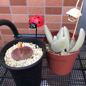 おはようございます。 先日、エケベリアたちに水遣りするのに、先の細い水差しが必要になったのでダイソーに探しに行ってきました。 目当てのものは見つけられませんでしたが、てんとうむしのガーデンピックを見かけて可愛いなーと思いこちらを購入しました🐞 なんとなくフォルムがリトープスに似てる気がしたので、日輪玉を見守ってもらおうと思います。に、似てないかな? 一緒にランタンのピックも購入しまして、こちらは白が似合う(あと差すスペースがある)福兎耳さんに。 今までガーデンピックに興味がなかったのですが、可愛いものがたくさんあるのですね(*'▽'*)たまには良いかもです。