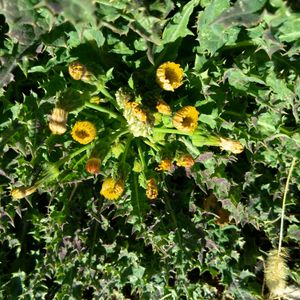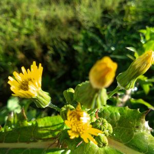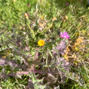 里山の麓歩き 道路脇にて オニノゲシ 葉っぱに刺があり 少しでも触ると痛い。 花は黄色で綺麗です。
