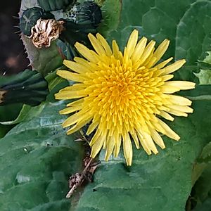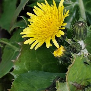 こんにちは(*^^*) 最近、養鶏場の卵🥚を買い始めたのです。 ・・・まだ2回目。 先日私も初めて行きました。 そこのすぐ前の畦道で、ふわもこ綿毛を見つけてパチリ📱 葉っぱの、恐ろしいほどのトンガリで、直ぐにオニノゲシだと判りました。 こんなに大きくなっちゃって、どうやって駆除するんだろ?? 【オニノゲシ】 キク科 ノゲシ属 ヨーロッパ原産。 世界中に外来種(帰化植物)として分布。 日本では1892年(明治25年)に小石川で発見されて、和名がついた。 花期は春から秋。たんぽぽのような黄色の花を咲かせる。頭花の径は約2cmで、舌状花のみから成る(構造はノゲシと変わらない)。 在来のノゲシは、葉の光沢が乏しく、葉縁のトゲは触っても痛くない。また、葉の基部の裂片が三角状に尖っている。 対して、オニノゲシは葉に光沢があり、葉縁のトゲは硬くて痛い!基部の裂片は円い。 まれに、中間種のアイノゲシが在る。