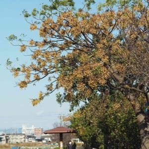 栴檀(センダン) センダン科センダン属の落葉高木。南国の木で、四国以南の温暖な地域の海岸近くに自生する。街路樹や公園樹としても植えられる。羽状複葉が羽状につく2回羽状複葉が特徴。花期は5~6月。花弁は5枚で淡紫色、雄しべは筒状に集まり濃紫色。花がびっしりつくので木全体が淡紫色に見える。果実は核果。直径1~1.5㎝の球形~楕円形で晩秋に黄色く熟す。葉が散った後も樹上にとどまり、表面がしわしわになって次第に白く色褪せる。1~2月にほかの木の実がなくなるとヒヨドリやムクドリが一気に群れて食べ尽くす。花は棟花(れんか)といい、畳の下に敷いてノミの予防に、火に入れて煙を出し蚊の駆除に用いた。 果実のつき方が数珠のように見えることから千珠(せんだま)、この転訛でセンダンの名がついた。また、梵語(ぼんご💬古代インドの文書語。サンスクリット)でchandanaと呼ばれていたのが音訳され転訛したとの説もある。一年草の栴檀草(センダングサ)の名前は葉の形が本種に似ることによる。 栴檀には魔除けの力があるとされ、平安時代に京の都で刑場前に植えられ、生首を枝に掛けてさらすのに使われた。斬首された人の霊を鎮める意味で選ばれたのではないかという南方熊楠の論考がある。現在でも墓場に植栽し、屋敷の敷地に植えるのを忌む風習もある。 出典『里山の花木ハンドブック』『日本有用樹木誌』『身近な木の実・タネ』『葉っぱで見わけ五感で楽しむ樹木図鑑』『薬草の呟き』