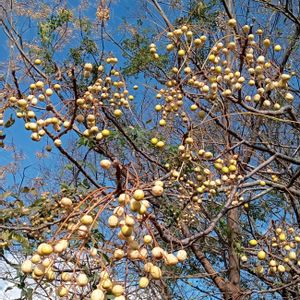 これは、センダン(栴檀)の実です。 花期は5月~6月で紫色の小さな花が咲きますが、木の高さが高くて、見るのが難しいです😃