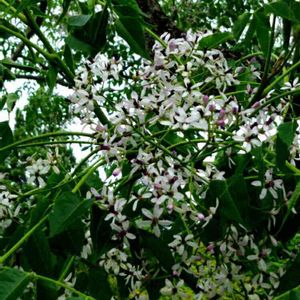 こんばんは🌙😃❗️ 今日はよく晴れて暑いぐらいの一日でした。😅💦 この間の雨🌂のせいでか? 急に、花や、葉っぱを食害するいわゆる、毛虫系の虫たちが活発に動きだしまして、いく先々のお客さまのところで、薬剤散布。😥 困った季節になってきました…。😥 そんな、お昼をかなり過ぎた一時…。 ようやく、川原で昼食。 唯一の日影が、この木の下。 最初はわかりませんでしたが、甘い香りが漂ってきます。 どうやら、この木に咲いてる花からで、蜜蜂🐝たちが、せっせと蜜を集めております。 いったいなんの木🤔 この木なんの木、気になる木ですが、一緒にいた同僚もわかりません…。 教えてタグをつけようかと思いましたが。 自力で答えをみつけました!😆 葉っぱの感じから、仮説で検索🔍 栴檀(せんだん)でした‼️✨ 花が咲いているのを見るのも、また、間近でみて、香りを嗅ぐのもはじめて。🔰 貴重な体験。🤣 これで、すっきり、夜も眠れそうです🎵😃 (疲れで寝ちゃうでしょうけどね…。😸)
