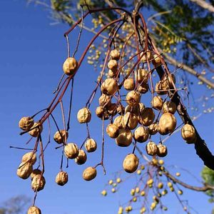 栴檀(センダン) センダン科センダン属の落葉高木。南国の木。5~6月に淡紫色の花が咲く。実は直径1~1.5㎝の球形~楕円形で晩秋に黄色く熟す。葉が散った後も樹上にとどまり、表面がしわしわになって次第に白く色褪せる。1~2月にほかの木の実がなくなるとヒヨドリやムクドリが一気に群れて食べ尽くす。 果実のつき方が数珠のように見えることから千珠、この転訛でセンダンの名がついた。また、梵語でchandanaと呼ばれていたのが音訳され転訛したとも。 栴檀には魔除けの力があるとされ、平安時代に京の都で刑場前に植えられ、生首を枝に掛けてさらすのに使われた。斬首された人の霊を鎮める意味で選ばれたのではないかという南方熊楠の論考がある。現在でも墓場に植栽し、屋敷の敷地に植えるのを忌む風習もある。 出典『里山の花木ハンドブック』『日本有用樹木誌』『身近な木の実・タネ』