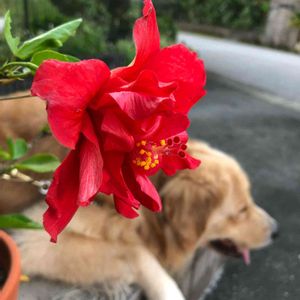朝んぽの後、ハイビスカス🌺と愛犬^_^
