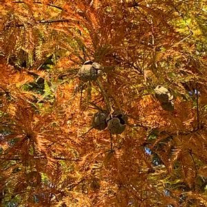 去年の残り実(種)と、葉っぱの様子 これ以上は近づけず、葉っぱを手に取ることもできない。 落羽松より繊細な感じ😊 ↑曖昧な表現💦