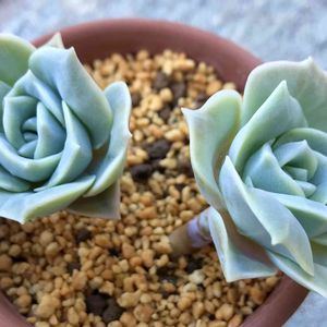 5月中旬に、 人生初、 ダイソーでラブリーローズを買ってきました。 ラブリーローズって、 高級多肉じゃないの?? え? 100円で買えるの?? ほんとに? か、買うよ! 買っちゃうよ! (それにしても、 私は何にも知らない女だなぁ)(笑) で、 カットして挿しておいたのが、右側の2枚で、 親株が左側です。 この子… 育てやすいですね。 1ヶ月で、 しっかり根付いて、 新しい子株もグングン育ってます。 (*゚0゚*)スッゴッイ! 今は肥料のせいで、 青緑色ですが、 秋に向けて可愛くなるといいなぁと思っています。