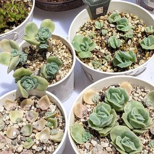 ラブリーローズの親子連れ 2021年9月27日 一番上の綺麗な子がカット挿し木です。 その対角線が親株です。 夏に取れた葉を置いておいたら芽が出てきました。 下のプラステラが今年の春の葉挿しっ子です。 ラブリーローズ、名前も可愛らしいのですが1年足らずでこんなに増えて丈夫で育て易いのかなぁと思います。