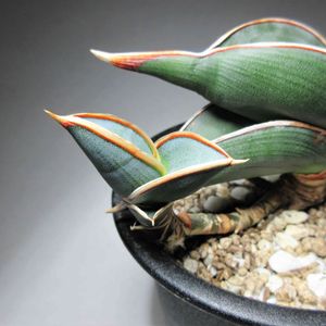 「サンスベリア ブルーキュー」 「サンスベリア」は親株にトラブルがあると 小さくても子株を付けることがあります 実験的に「ブルーキュー」の成長点を切って 数か月放置したところ地下茎を確認したので 地上に誘導して今は子株が成長しています 毎日色々な子株に癒されています!