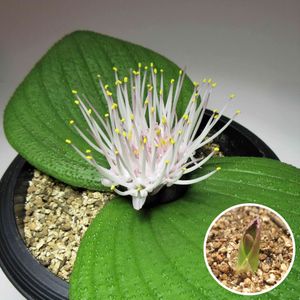 裸の状態で放置していた「マッソニア」の 球根を秋に植え込み半信半疑の水やりで 芽が出て蕾を確認してやっと咲きました ウチの環境でも育つことが分かりましたが どこか物足りないような気がします はじめて育てた「ケープバルブ」になります