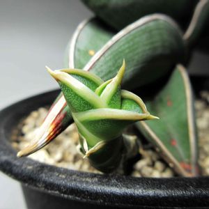 「サンスベリア キスマヨ 曙斑」 長い間動きが無かったのでもう駄目だと 諦めていましたがようやく動き出して 中心部分から新しく芽が出てきました 少し大きくなったら切り離して発根させるか ずっとこのまま育てて行くか思案中です