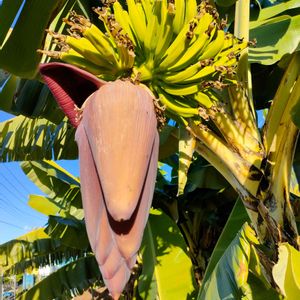 バナナの実。 バナナの実がどうやってついてくるか知らない人も多いと思いますので、つき始めたところの画像です。 こんな感じで花びらが捲れると身が出てきて、だいたい7段くらいになりますよ。 これの品種はブラジルバナナ、和名だと黄輝バナナという品種です🍌