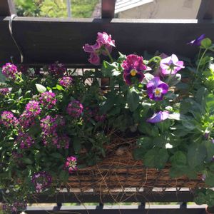 左上のフリル咲きパンジーに一目惚れして苗が欲しかったのですが在庫が寄せ植えのみとのことだったので、予定外でしたが寄せ植えを丸ごと購入しました😊 ベランダが一気に華やぎ朝を迎えるのが楽しみになりました(*^^*) 柔らかな紫でまとめられていて、右上は赤っぽい紫のミュシャとビオラ 背面には明るいワイン色のガーデンシクラメン、高いのはエレモフィラニベア。 夏になったら今度は自分で夏のお花を植えてみたいなと思っています。