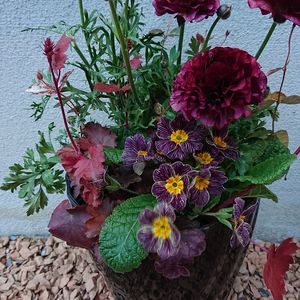 すっかり春らしくなりました。玄関先の寄せ植えも花盛りです。 今年は、ワイン色〜ローズ系〜ピンクのグラデーションでまとめてみました。