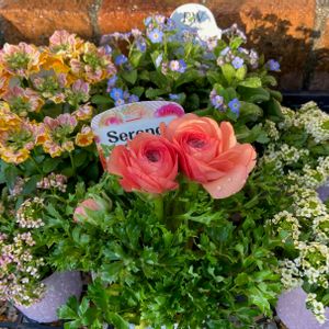 寄せ植え🌼 バラ咲きジュリアン M'sセレクション (松原園芸さん) ラナンキュラス セレンディ ローダンセマム アフリカンアイズ ラナンキュラス、艶があって素敵な色です✨ 松原園芸さんのジュリアンは、かすれた感じのシックな色♡
