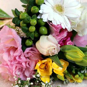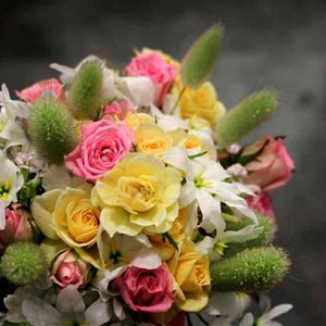 春の花束です 色んな形状のお花を綺麗に組むのが難しかったです