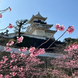 掛川城と掛川桜🌸 今日はお城近くの和牛肉のステーキ丼を食べに掛川城周りも散策。 お城とお城周りの川沿いには掛川桜が満開でした。 ※掛川桜〜河津桜に似た濃いめのピンクの花ですが、うつ向き加減に下向き咲くのが特徴らしいです。
