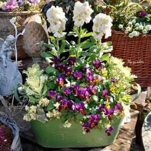 明けましておめでとうございます🎍 本年もよろしくお願いします♪ 健康で元気に過ごせる一年になりますように✨ ①12月に寄せ植えした子達の記念撮影です💐 中央のリースは12月の誕生日プレゼントに主人からガーデンシクラメンをもらいリングバスケットに初挑戦💓 どうにか完成しました〜 🙌🥰 花を置いてる台は全部主人の手作りです👨 ②とても素敵な花色のレディビオラ③一目惚れした庭人さんのビオラ 何度見てもウットリする色ですよ💚💙💛💜🩵✨🙌